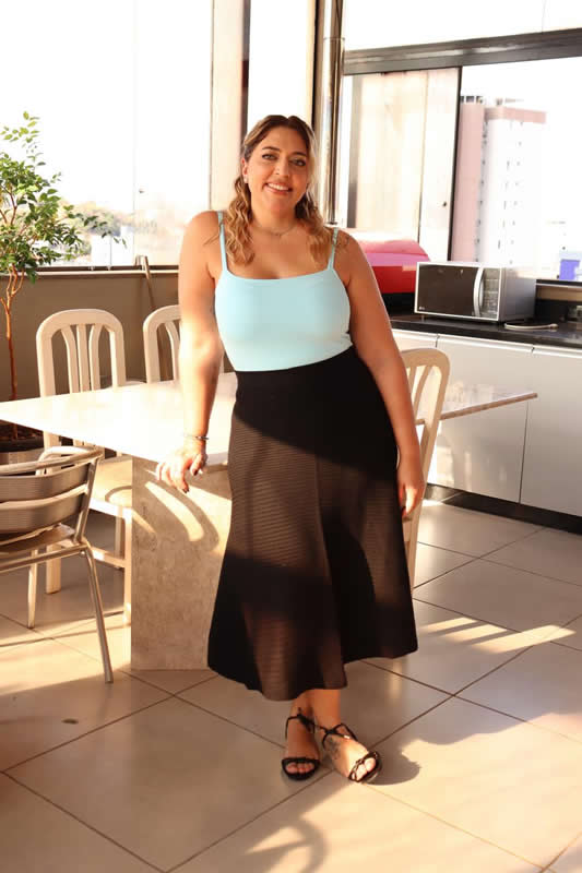 A saia Midi Rodada de Tricô é a peça perfeita para quem busca um visual feminino, elegante e confortável.