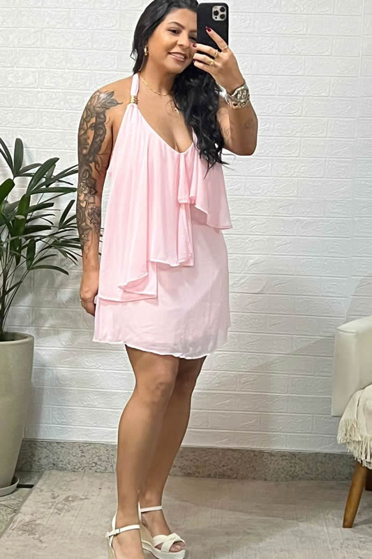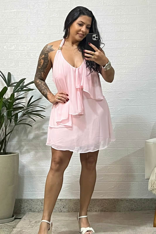 Encante-se com a delicadeza do vestido curto com babados, uma peça pensada para quem busca leveza e